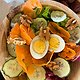 Lattuga romana, insalata riccia e radicchio croccanti, arricchiti da ciuffi di carota, uovo sodo