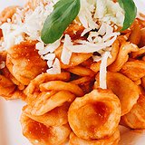 Orecchiette di senatore cappelli, saltate con sugo di pomodoro ciliegino rosso, formaggio cacioricotta fresco, basilico, un piatto semplice ma ricco di tradizione.
