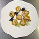 BOCCONCINI DI RANA PESCATRICE, BACON, CREMA DI PATATE ALL'ALGA SPIRULINA,VERDURE