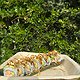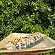 Riso, alga yakinori gold, sesamo b/n, granchio*, mango, granella pistacchio, banana, philadelphia, teriyaki