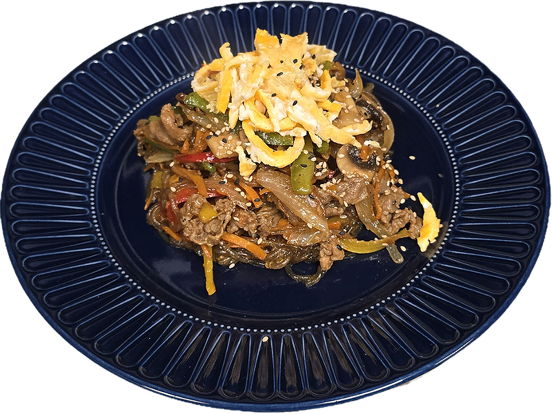 Gli spaghetti di patata dolce saltati in padella con verdure fresche (carote, spinaci, funghi, peperoni) e carne marinata. Un classico coreano, condito con salsa di soia e olio di sesamo. Disponibile versione vegana.