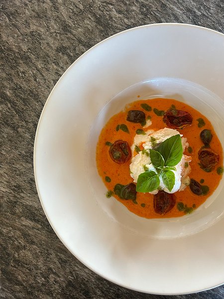 Ricottina con pesto di basilico, pomodorini confit e olive taggiasche