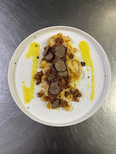 TAGLIOLINI AL RAGU' DI AGNELLO,TARTUFO NERO,SALSA DI CAMOMILLA,ZAFFERANO E MIELE