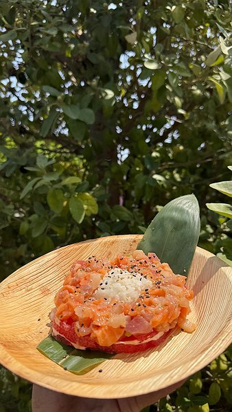 Riso bianco, salmone*, tonno*, ricciola*, pompelmo rosa, tobiko*, tabasco, erba cipollina, maionese, salsa ponzu