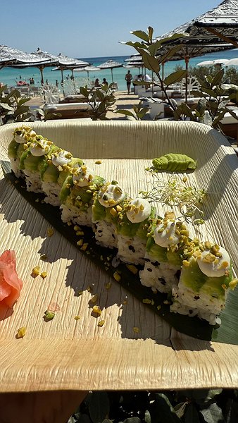 Riso, alga yakinori gold, sesamo b/n, salmone*, philadelphia, avocado, granella di pistacchio