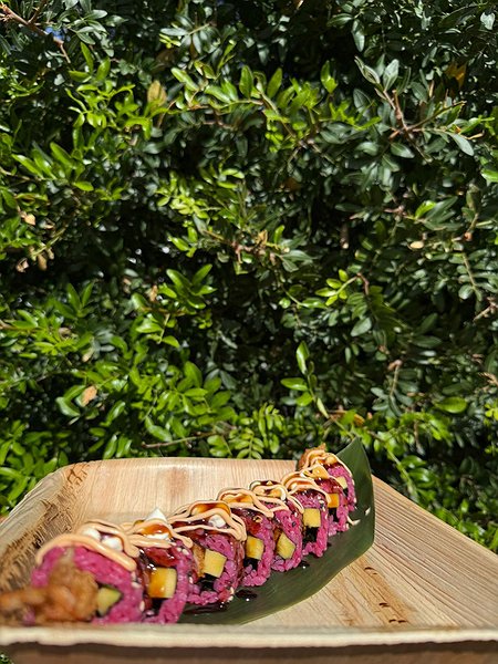 Riso rosso alla barbabietola, alga yakinori gold, sesamo b/n, crema barbabietola, gamberi* tempura, mango, philadelphia, teriyaki, maionese piccante