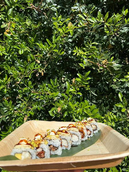 Riso, alga yakinori gold, sesamo b/n, granchio*, mango, granella pistacchio, banana, philadelphia, teriyaki