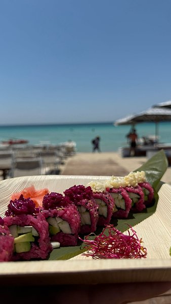 Riso, alga yakinori gold, sesamo b/n, crema alla barbabietola, avocado, cetriolo, mango, cavolo viola, cavolo bianco, maionese
